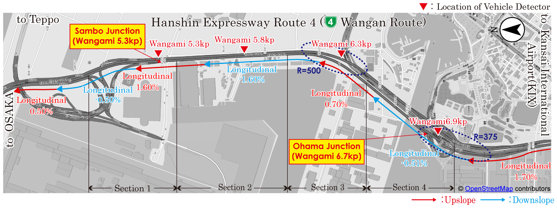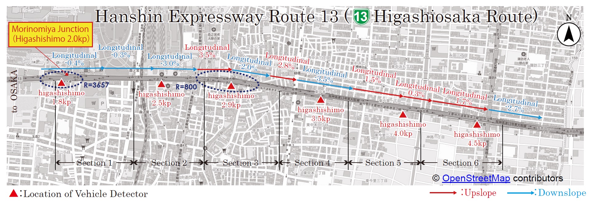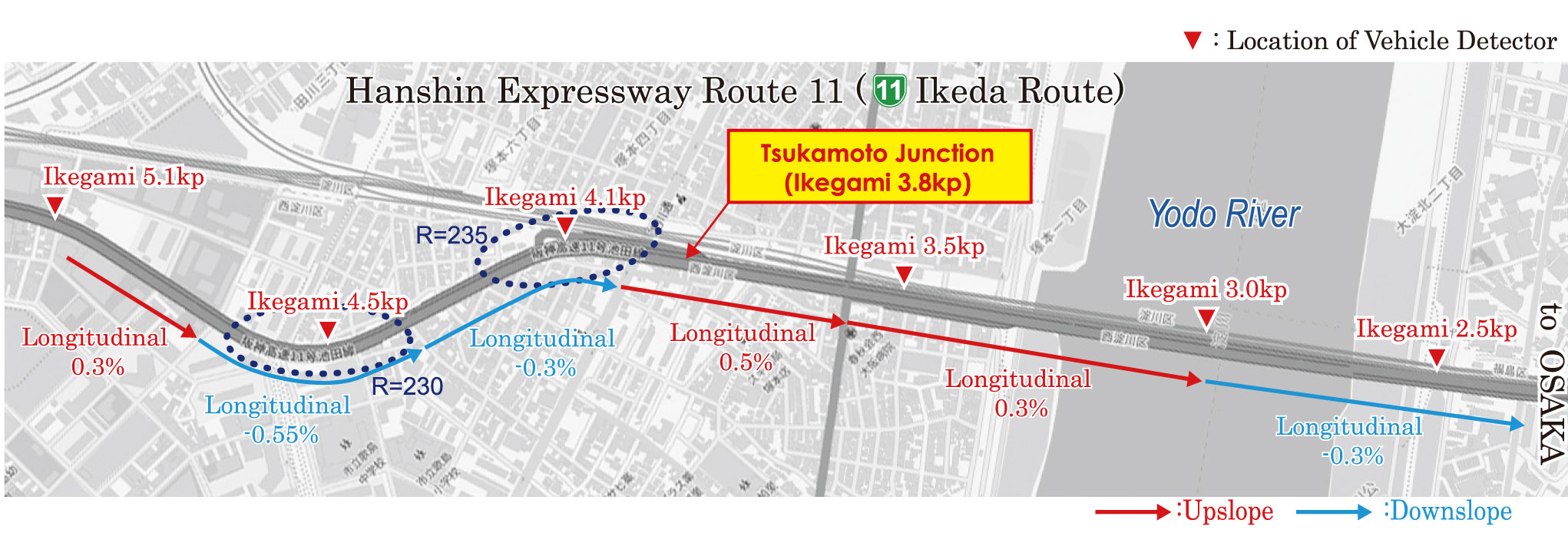 A.As of February 2023, data from the approximately 2 km section of the Hanshin Expressway Route 11 Ikeda Line (Osaka bound) nearby the Tsukamoto Junction